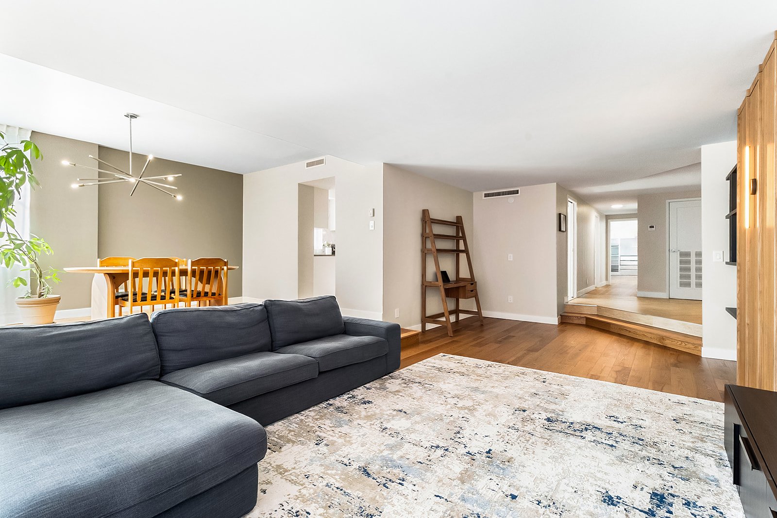 Le salon en contrebas, baigné de lumière naturelle grâce à